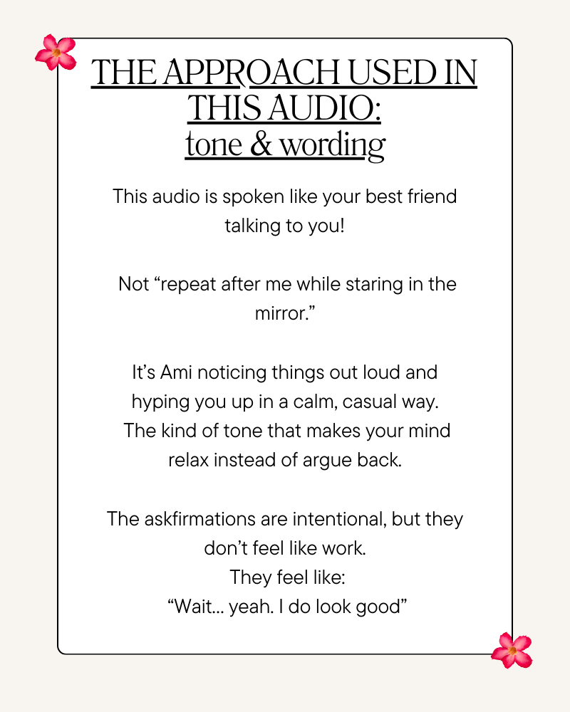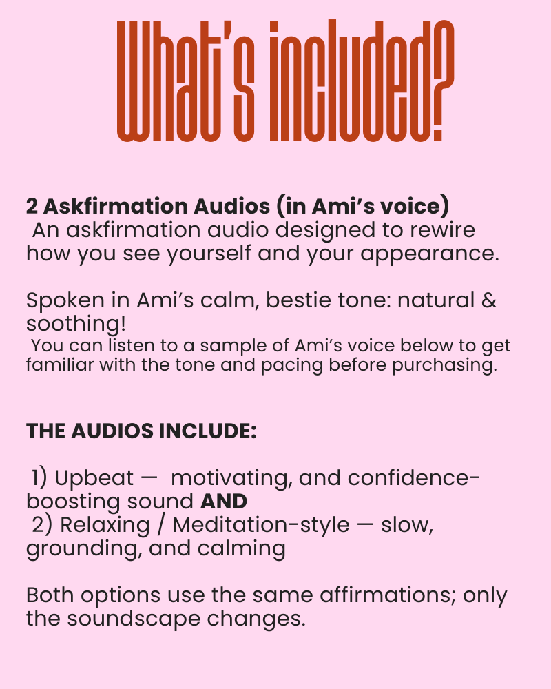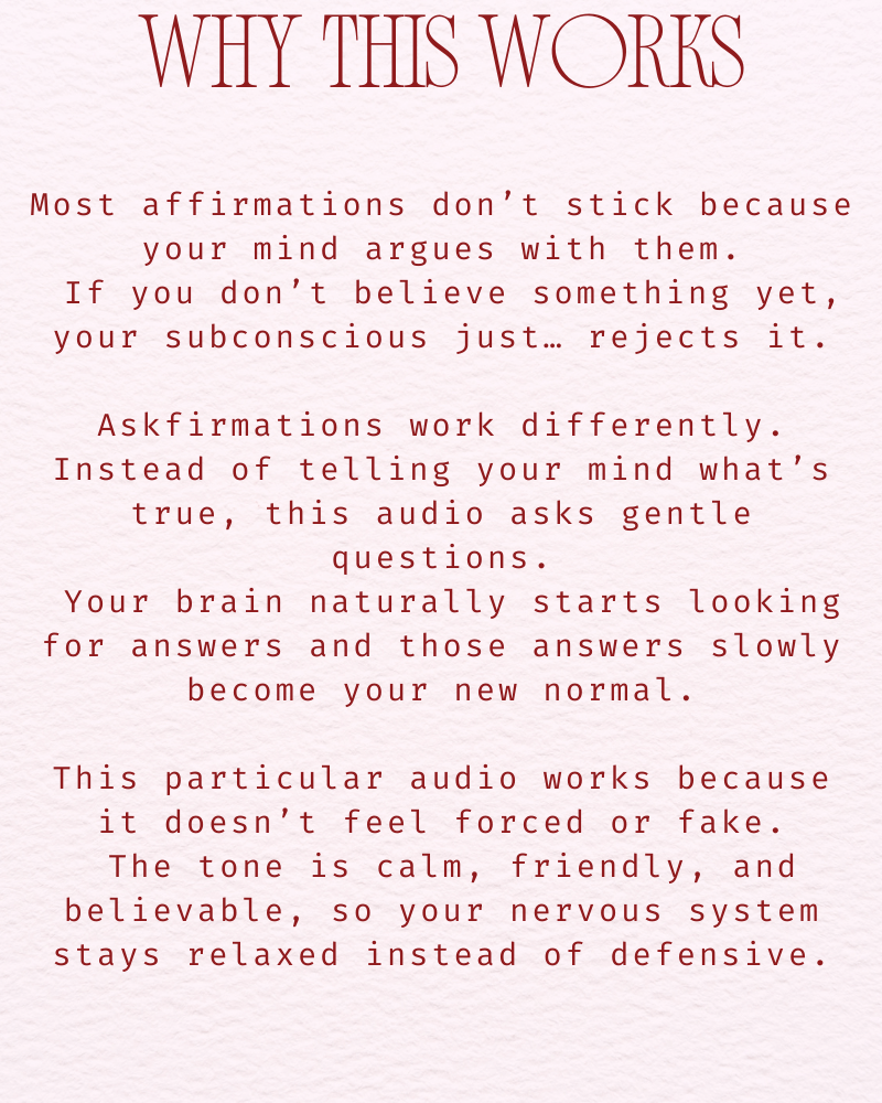 This audio exists because I healed that. Not by forcing confidence. Not by pretending I didn’t care. But by re-training my subconscious to become the authority on how I see myself.